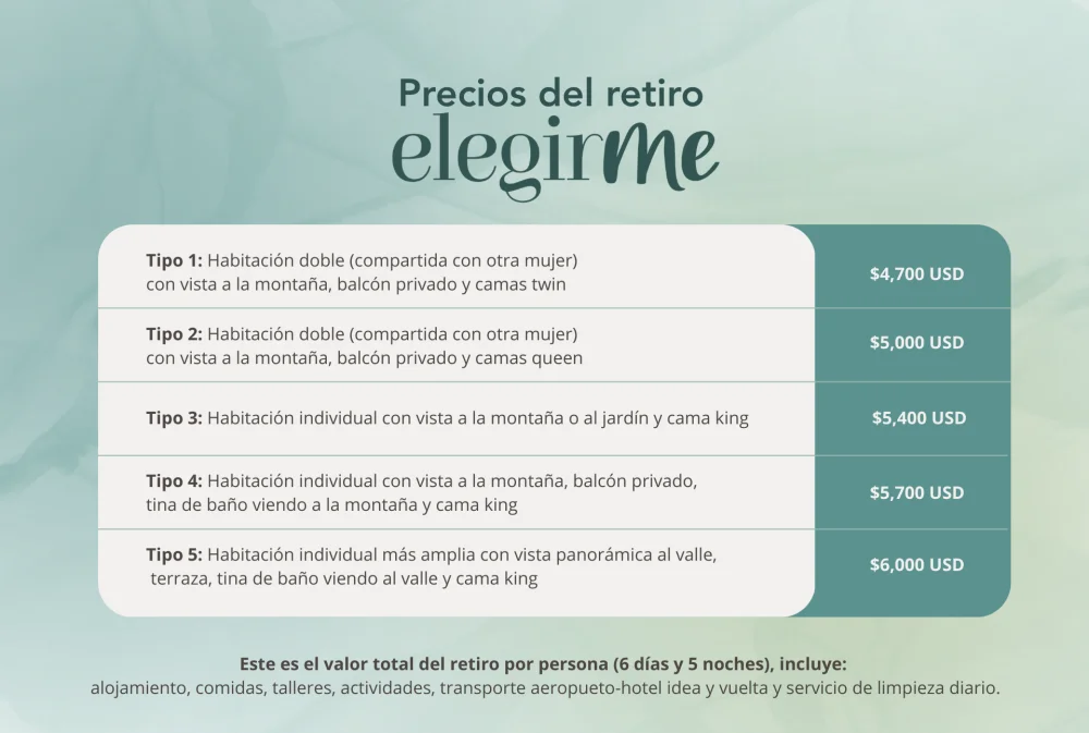 Nota importante: Las habitaciones Tipo 1 y Tipo 2 están diseñadas para compartirse con otra participante. Si prefieres no compartir habitación, te recomendamos seleccionar una opción de habitación privada para mayor comodidad durante el retiro. ✨